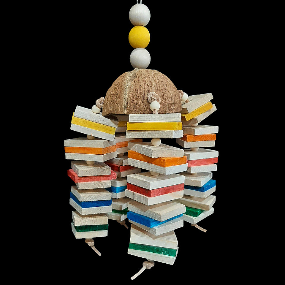 Sixty natural and colored pine wood slats with small wood snap beads strung on veggie tanned leather lace from a coconut shell half. The coconut shell hangs from nickel plated chain with hardwood balls on the top.