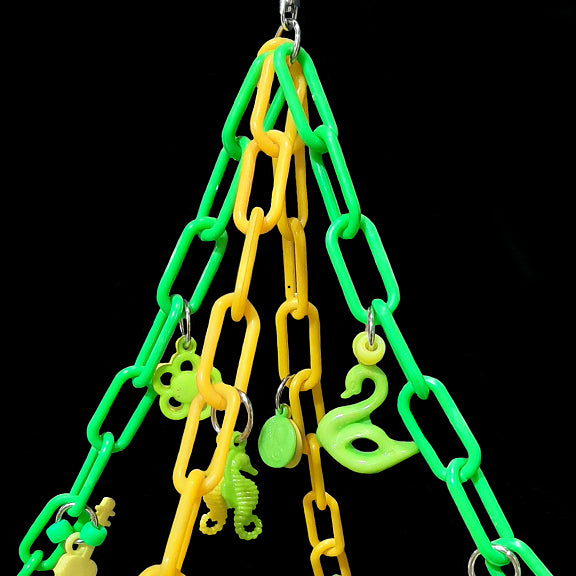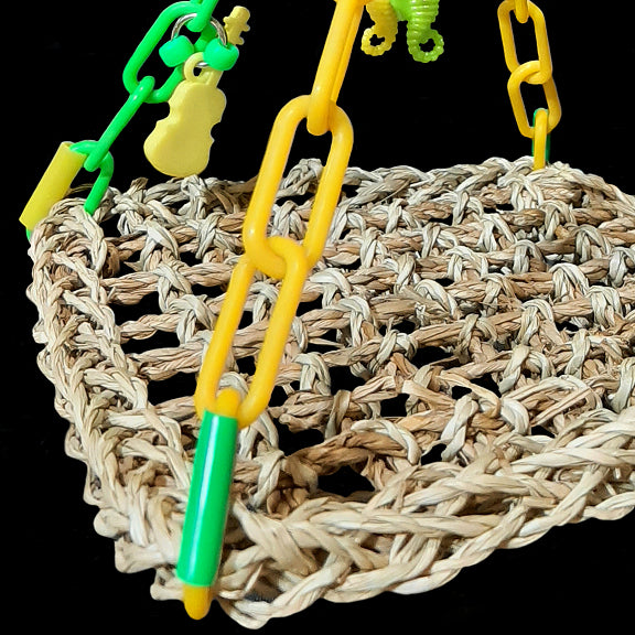 A fun hammock made with a 7" by 7" seagrass mat suspended by plastic chain and adorned with assorted charms. Makes a great swinging perch or play gym for small birds. Ideal for lovebirds, budgies, parrotlets, linnies, small conures, etc.