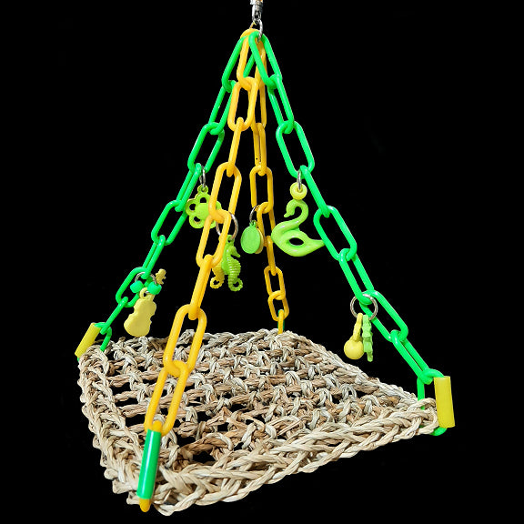 A fun hammock made with a 7" by 7" seagrass mat suspended by plastic chain and adorned with little toys. Makes a great swinging perch or play gym for small birds. Ideal for lovebirds, budgies, small conures and cockatiels.