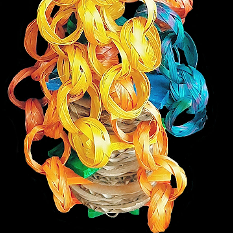 An exciting multi-textured toy with wiggle and jiggle! Brightly colored pine slats, lots of cardboard rounds and bamboo chain strung on nickel plated chain. Designed for lighter chewers. Can also be hung from end to end to form a bridge toy.