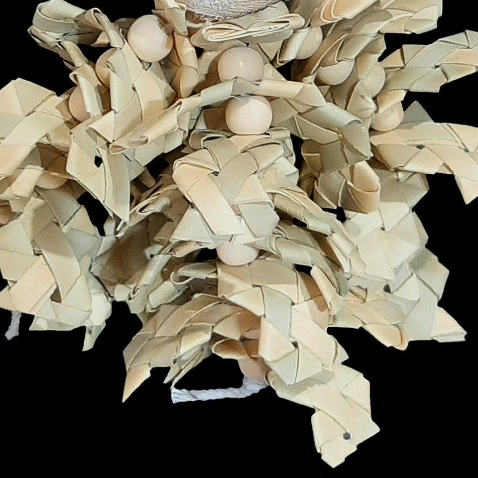 Four strands of crunchy zigzag palm leaf shredders and small wood snap beads dangling under a yucca button. Strung on cotton cord. Designed for small birds such as budgies, lovebirds, linnies and other small parrots that prefer to shred.